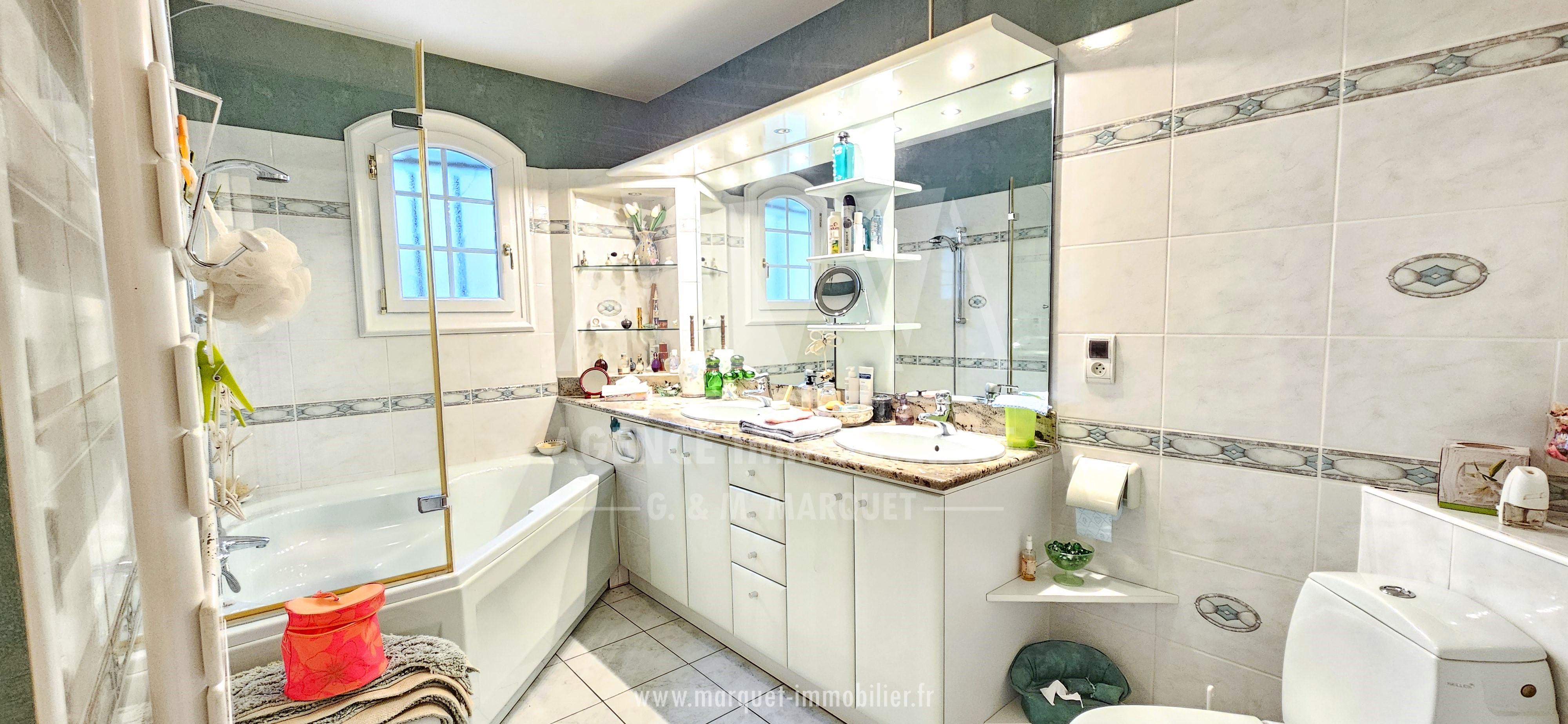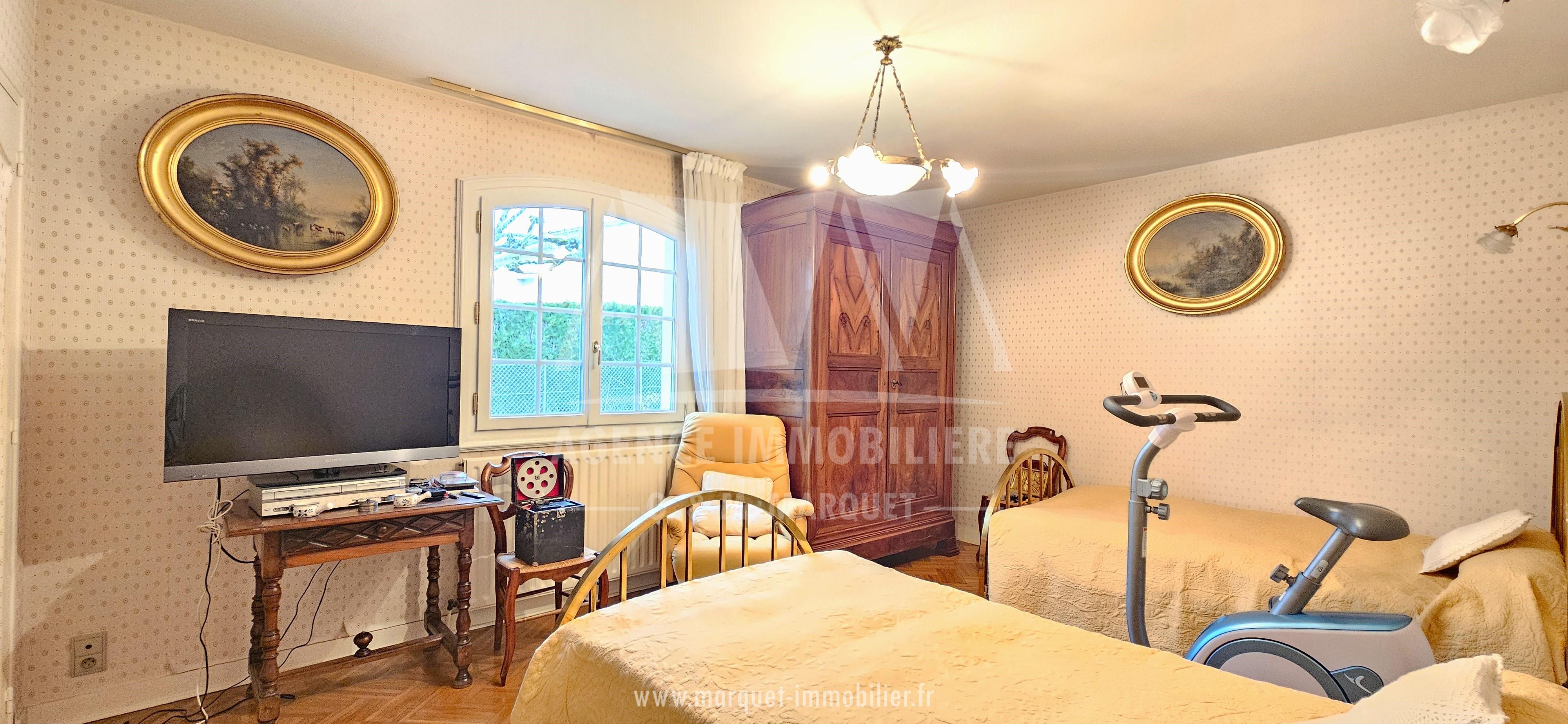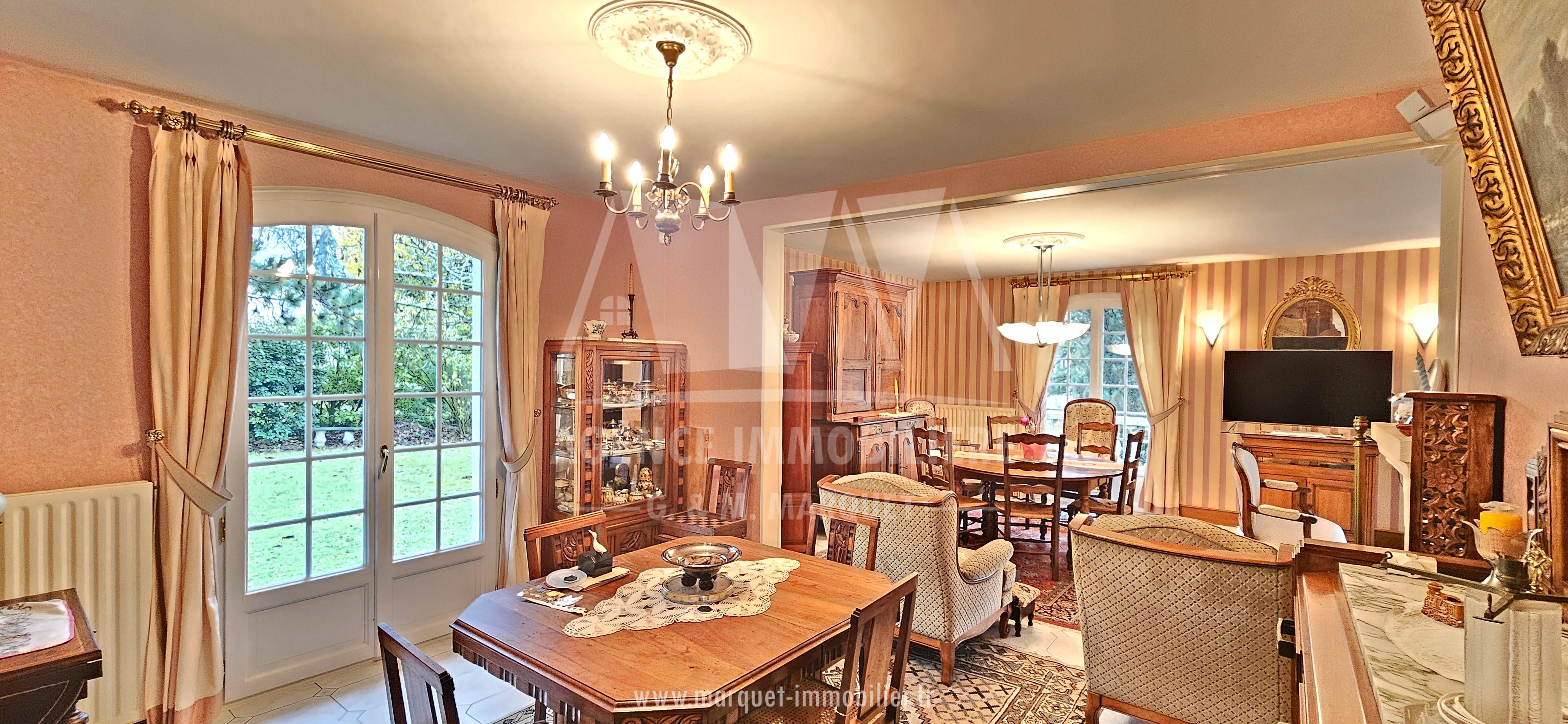 D'une entrée, à la suite du salon très lumineux de 28,10 m² avec cheminée ouvert sur la terrasse côté SUD, d'une partie séjour de 14,28 m² donnant accès sur la cuisine entièrement équipée de 14,28 m² avec éléments encastrés, d'une arrière cuisine de 19,14 m², d'un premier dégagement avec placards et un WC, un bureau pouvant se transformer en chambre de 12 m², d'un second dégagement desservant 3 chambres de 17,85, 14,14 et 12 m², d'une salle d’eau/WC (6,17)et d'une salle de bains/WC (6,86)