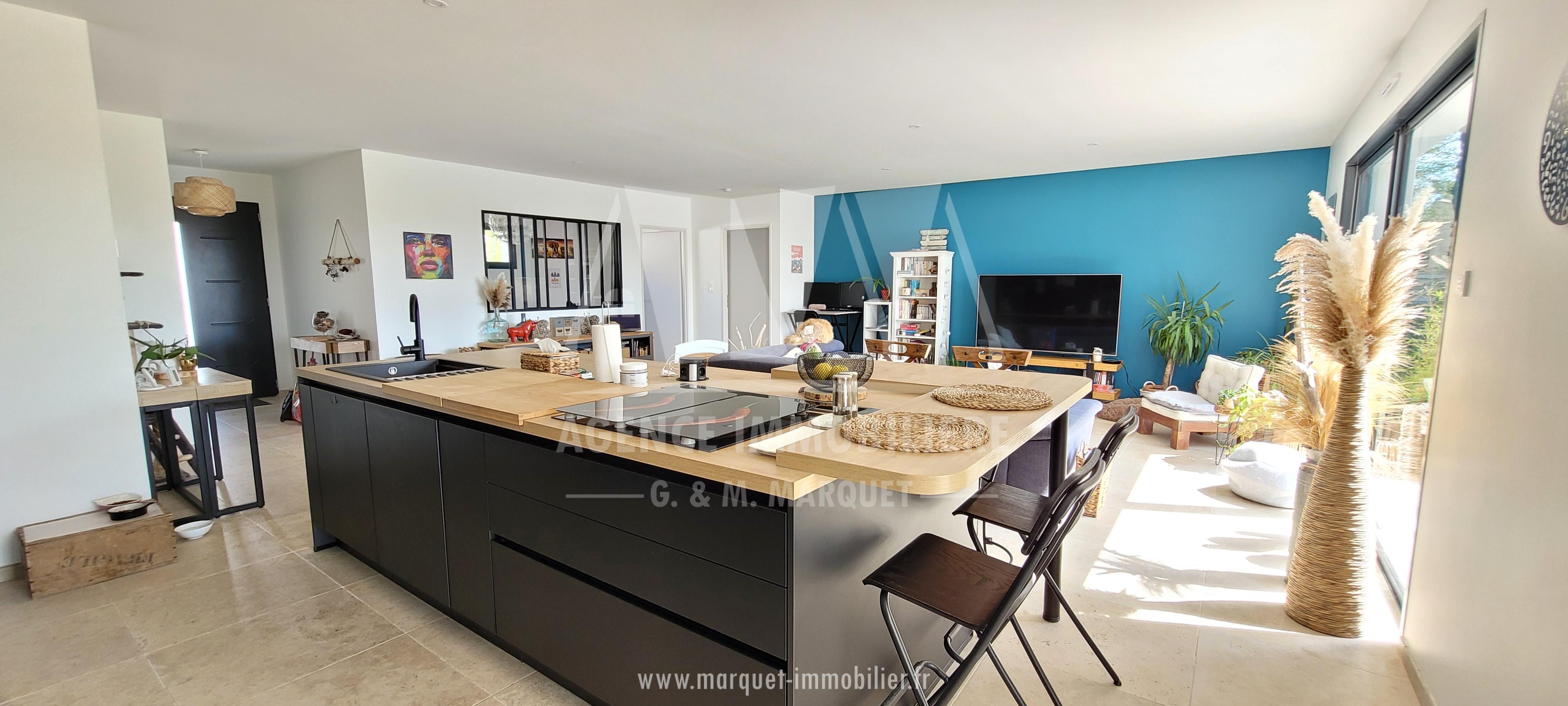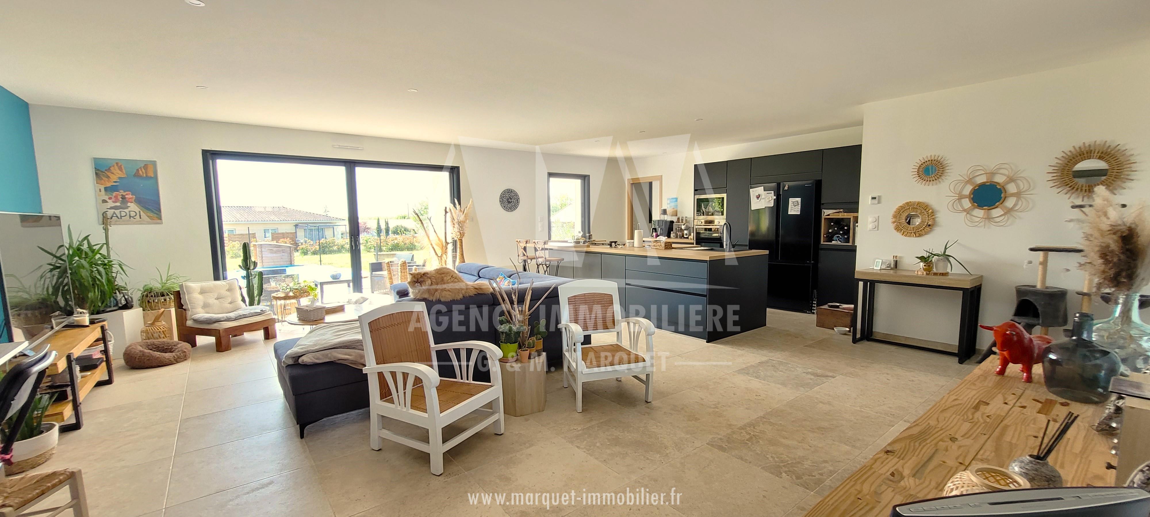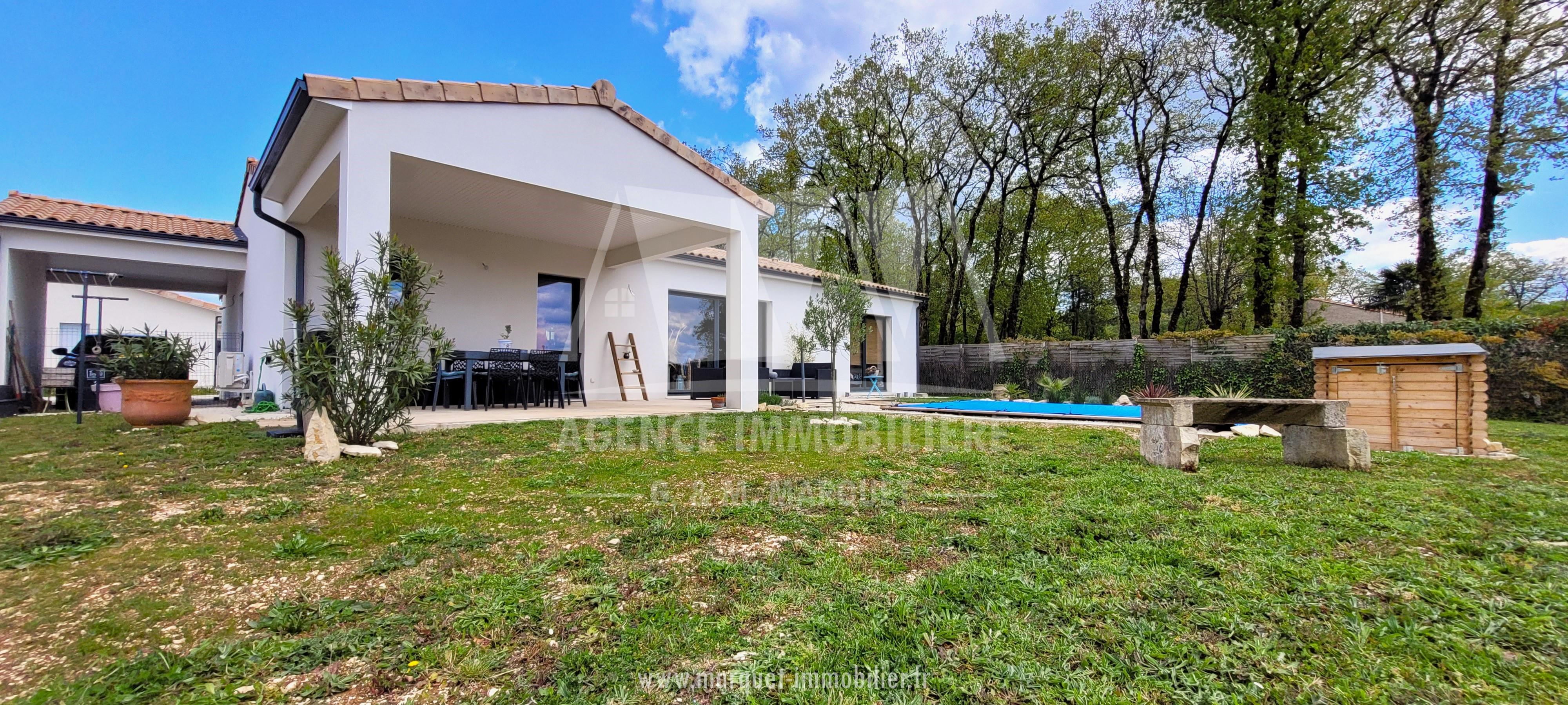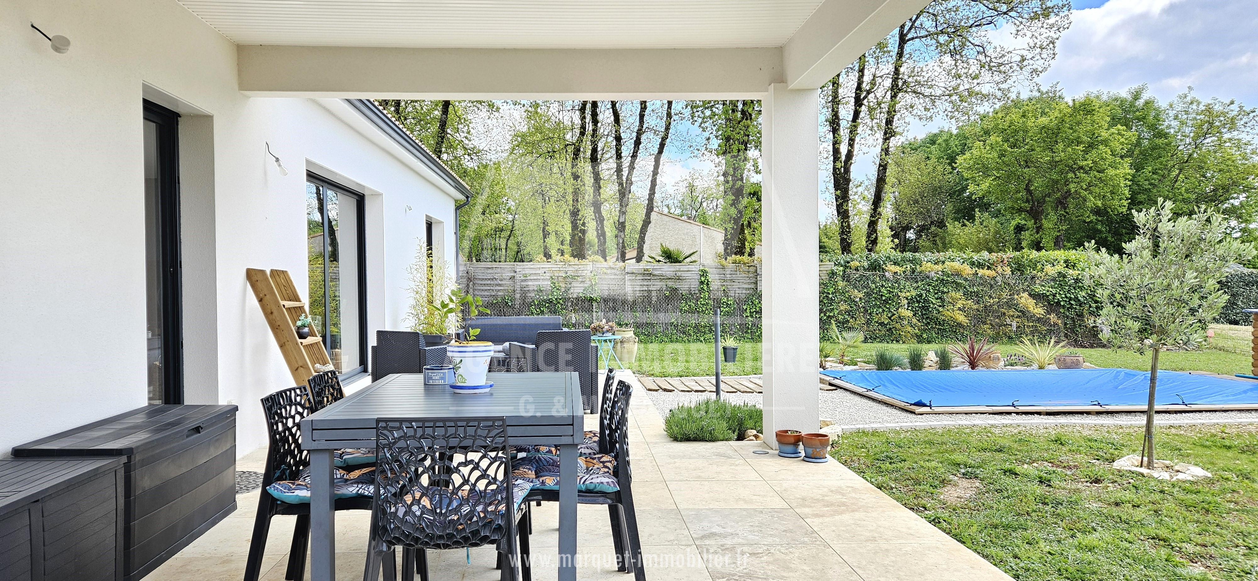 Confortable pavillon NEUF de 2022 de plain-pied de 113,60 m² avec garage de 20,88 m², carport de 14,30 m², terrasse couverte de 19,77 m² et piscine, le tout sur un terrain de 774 m².