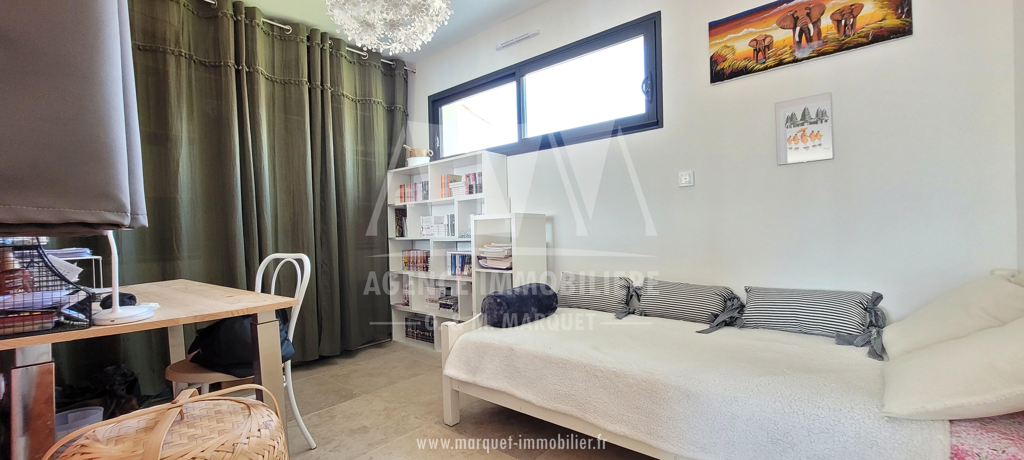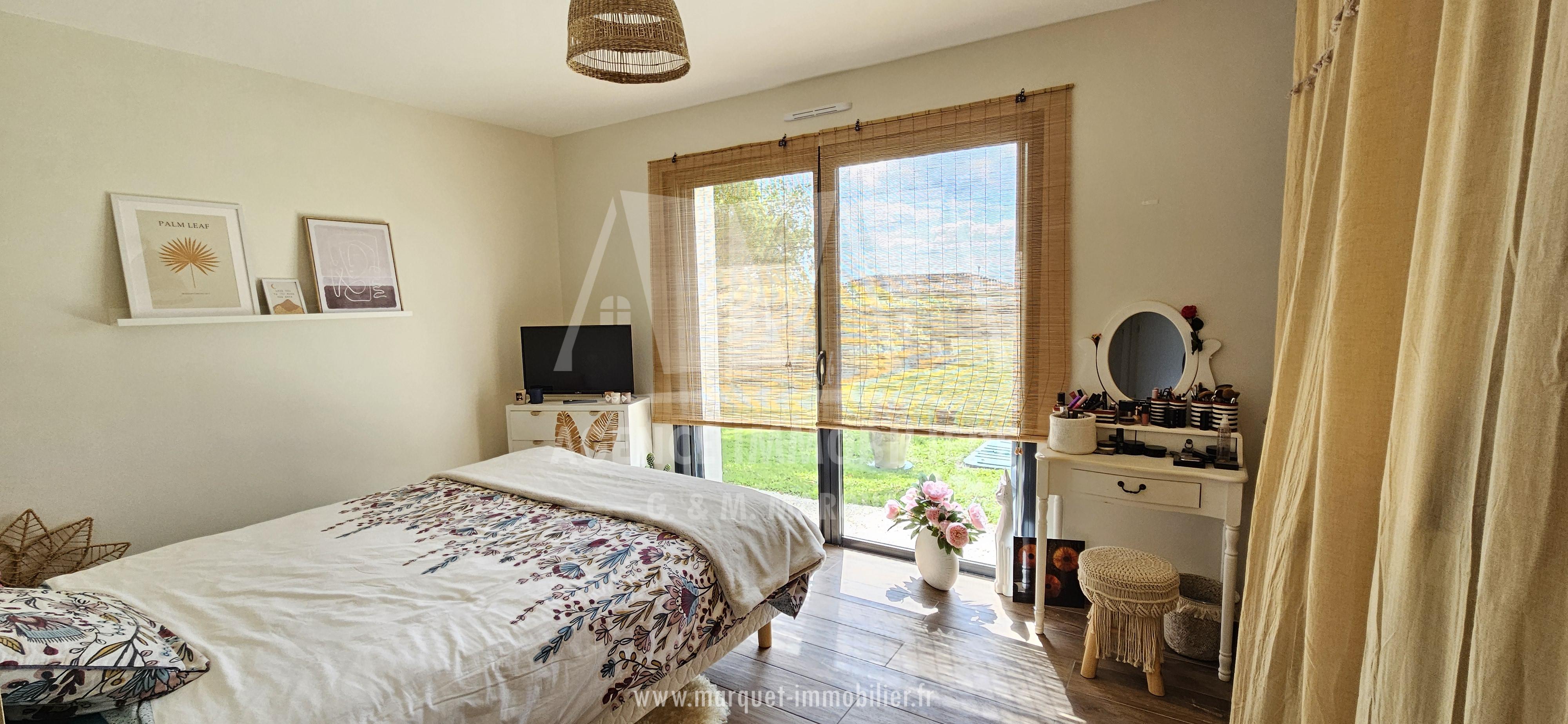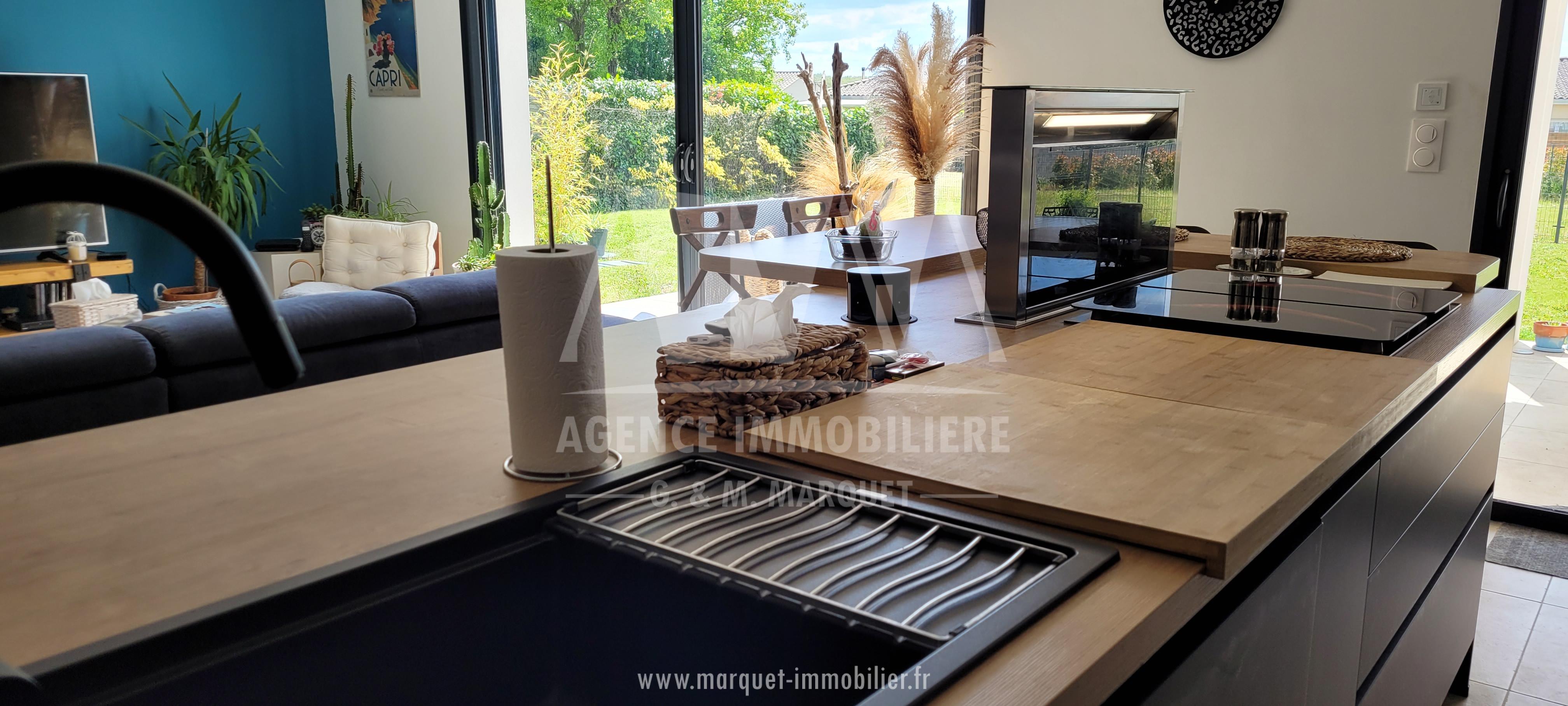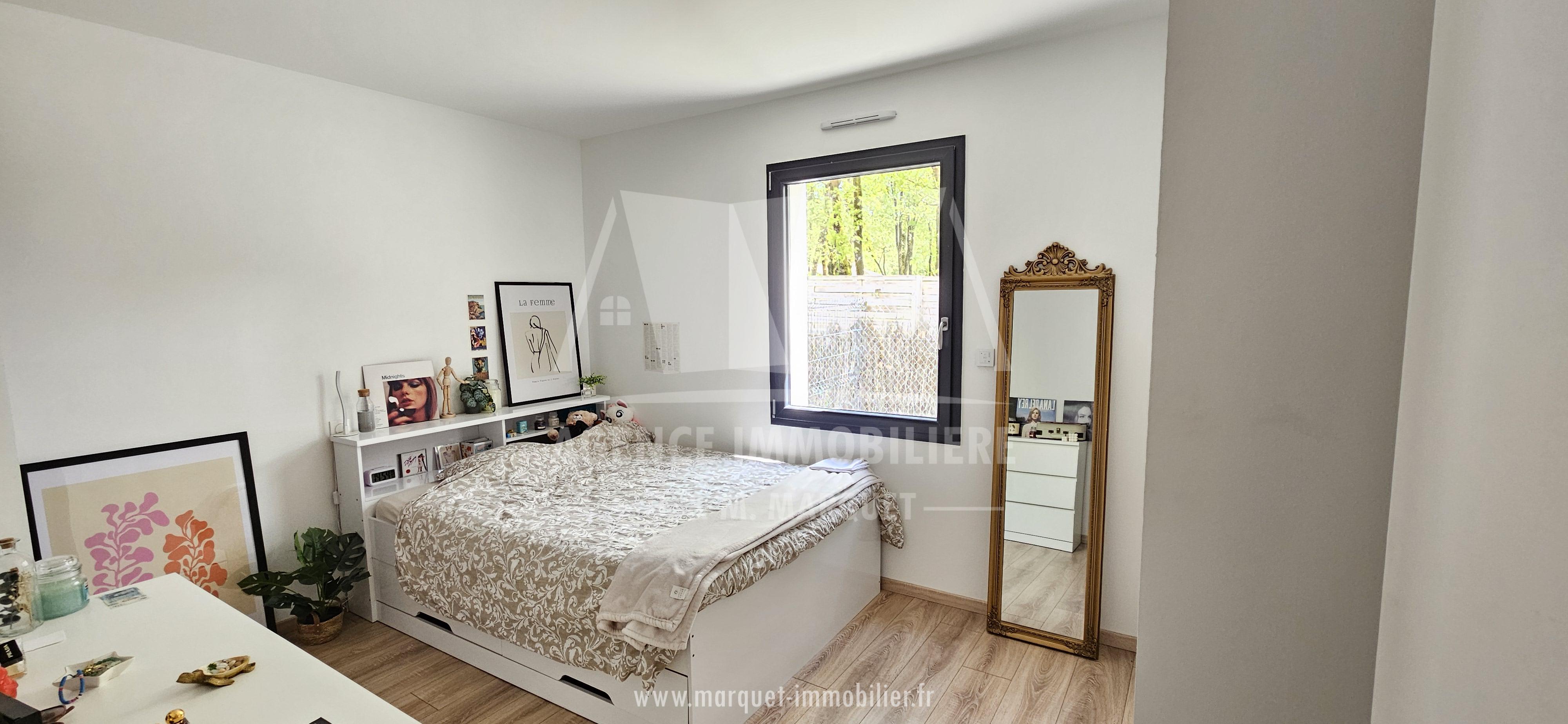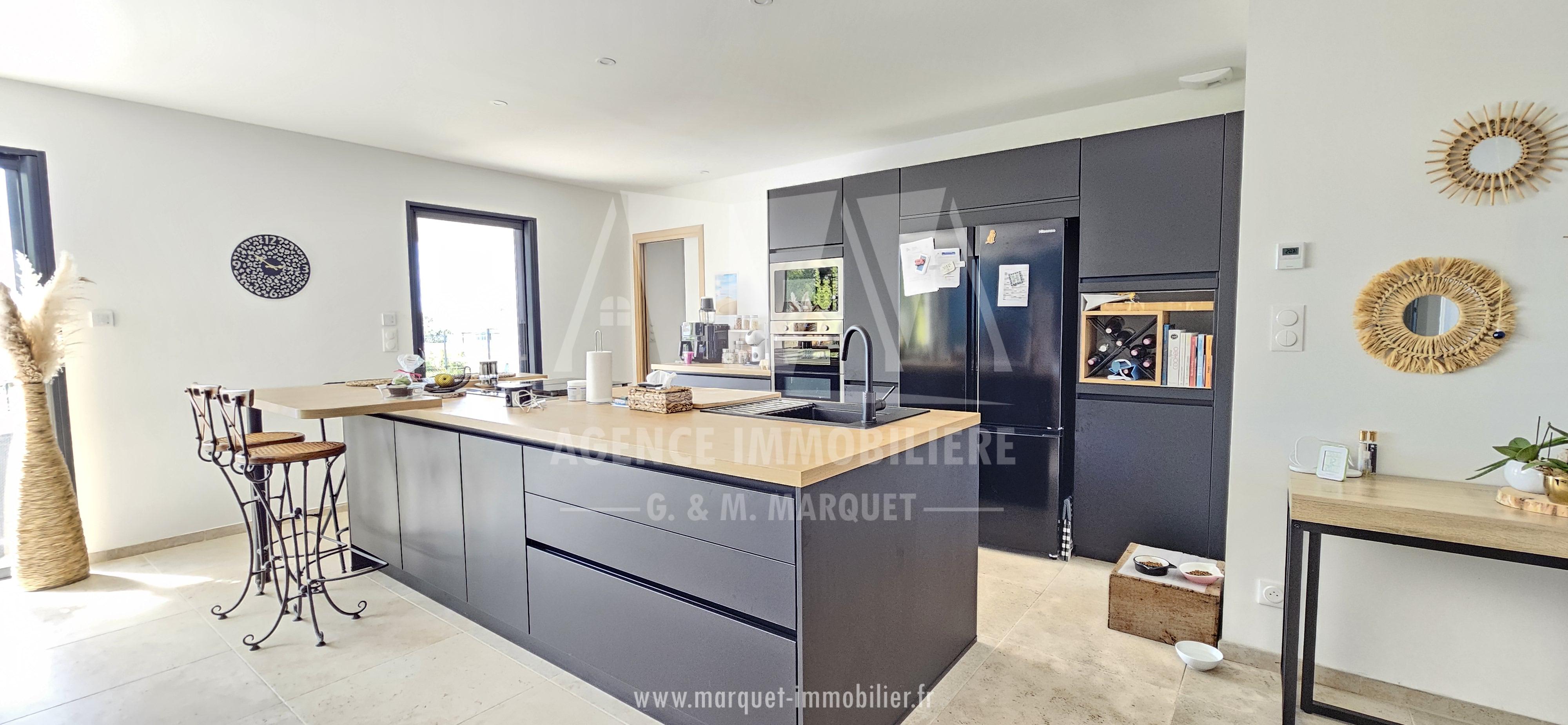 Confortable pavillon NEUF de 2022 de plain-pied de 113,60 m² avec garage de 20,88 m², carport de 14,30 m², terrasse couverte de 19,77 m² et piscine, le tout sur un terrain de 774 m².