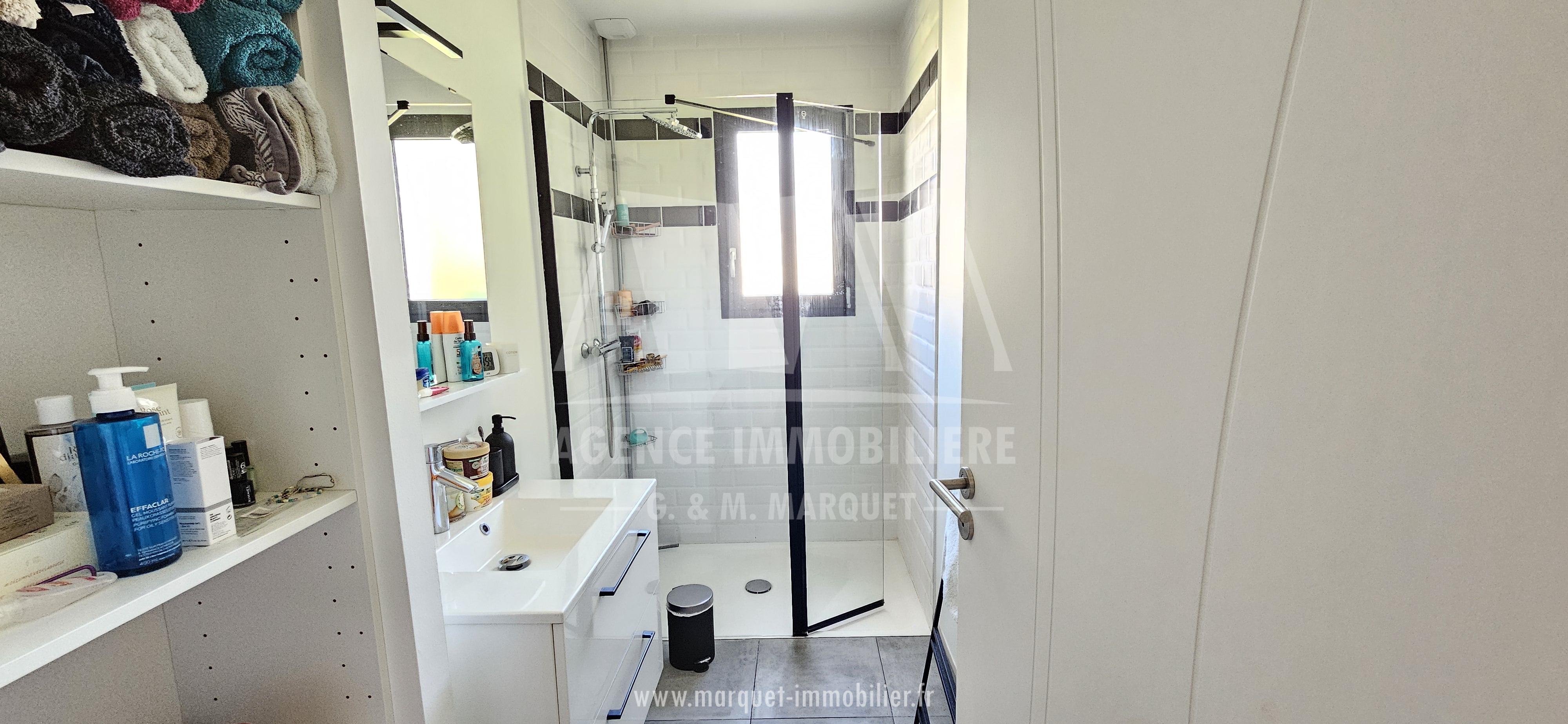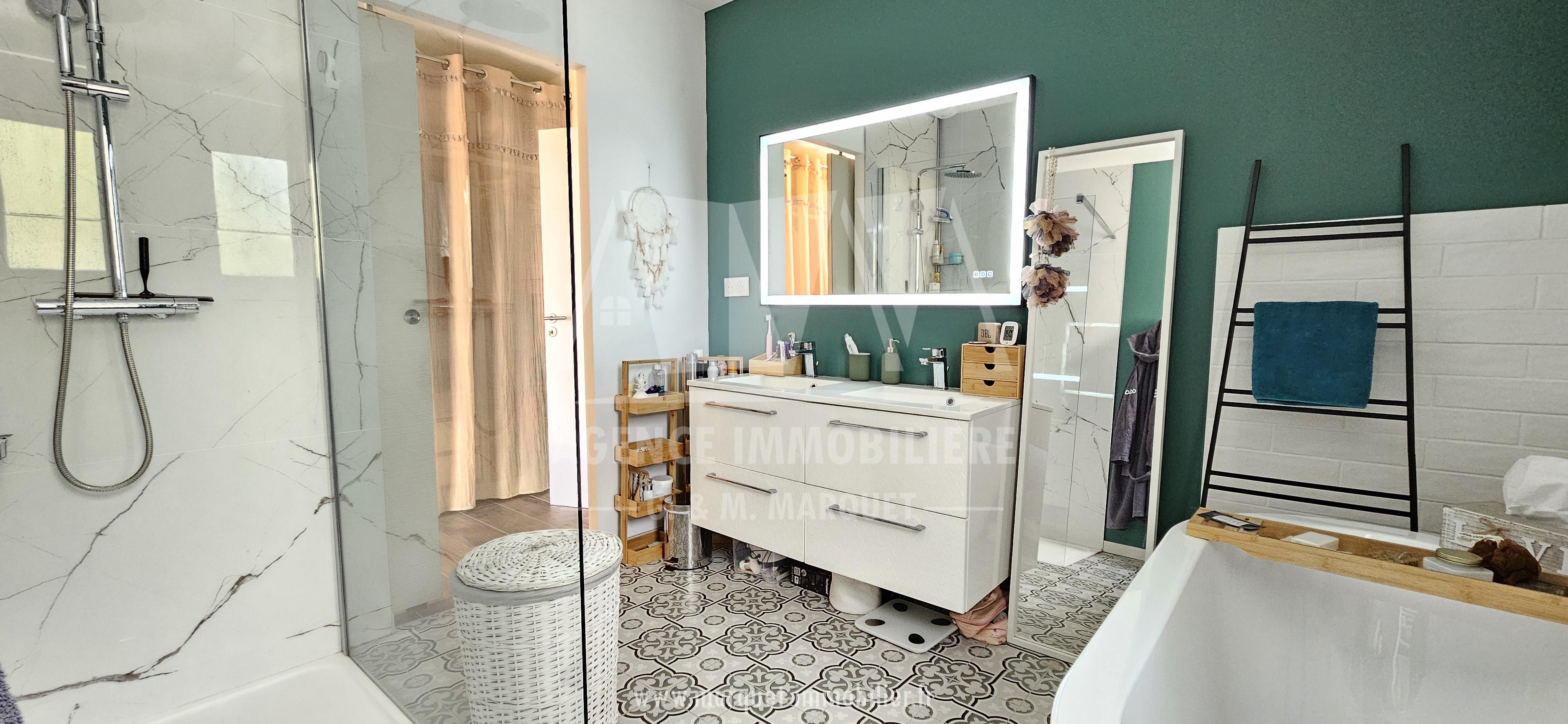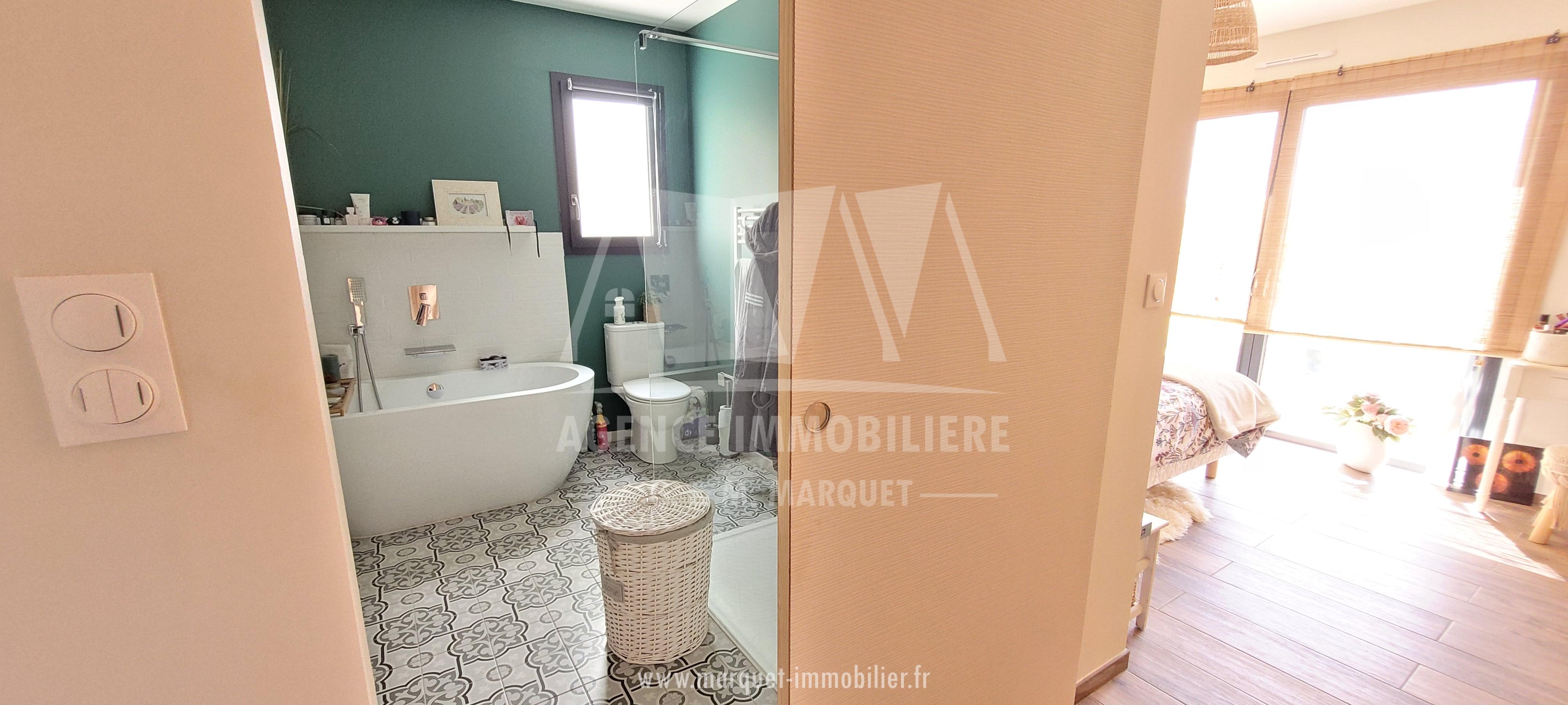 Une entrée avec placards, une pièce de vie/ salle à manger/ belle cuisine équipée de 54,04 m², un cellier de 8,38 m², un bureau ou chambre avec verrière, un WC, un dégagement desservant une suite parentale de 24,19 m² avec chambre, grand dressing et salle de bains/douche/WC, une seconde chambre de 11,48 m² et une salle d'eau indépendante de 4,23 m².